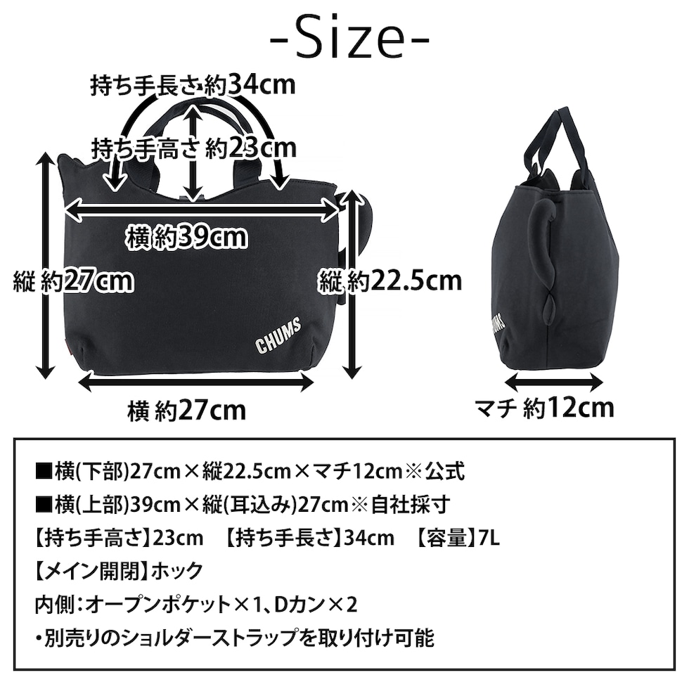 | サイズ(約) ※当店実寸値 | 公式サイズ 横(下部)27cm×縦22.5cm×マチ12cm 自社採寸サイズ 横(上部)39cm×縦(耳込み)27cm 【持ち手高さ】23cm 【持ち手長さ】34cm 【容量】7L | ||