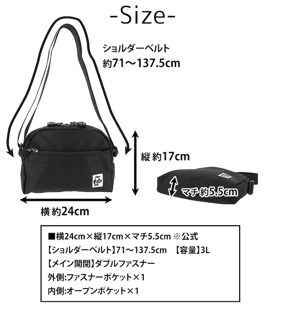 | サイズ(約) ※当店実寸値 | 公式サイズ 横24cm×縦17cm×マチ5.5cm 【ショルダーベルト】71cm~137.5cm(幅3cm) 【容量】3L | ||