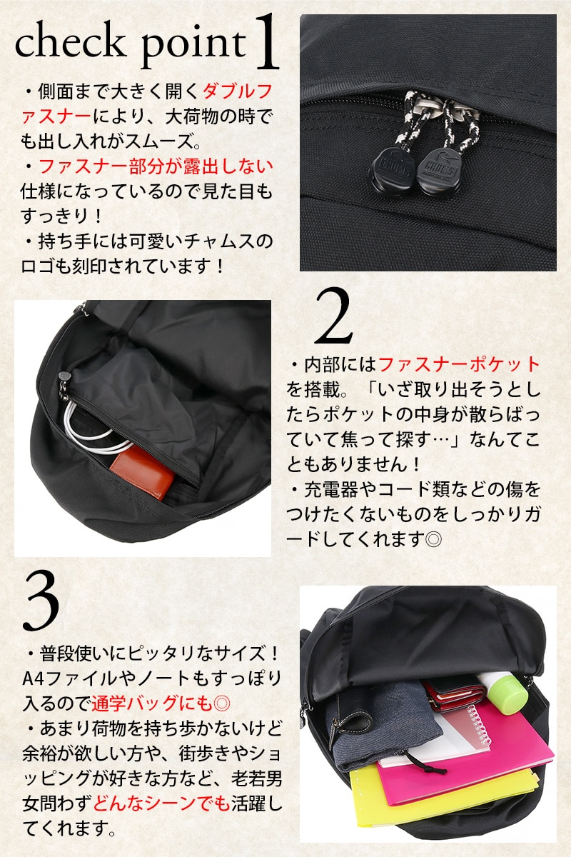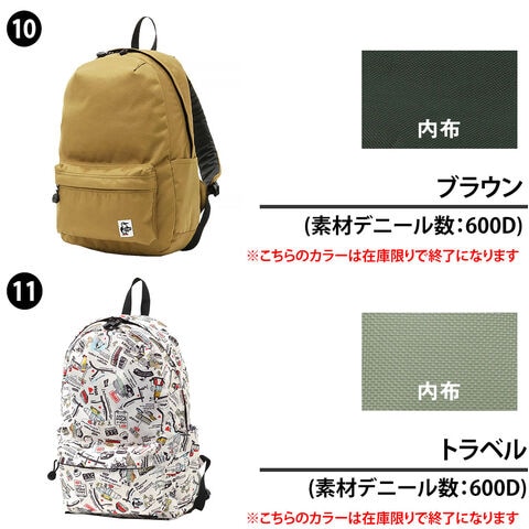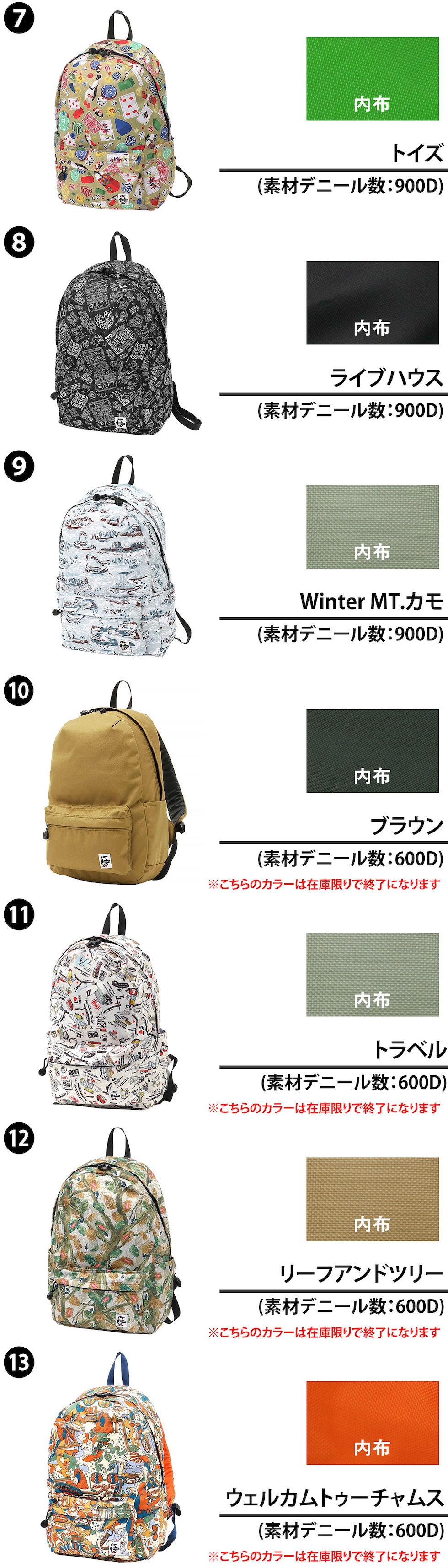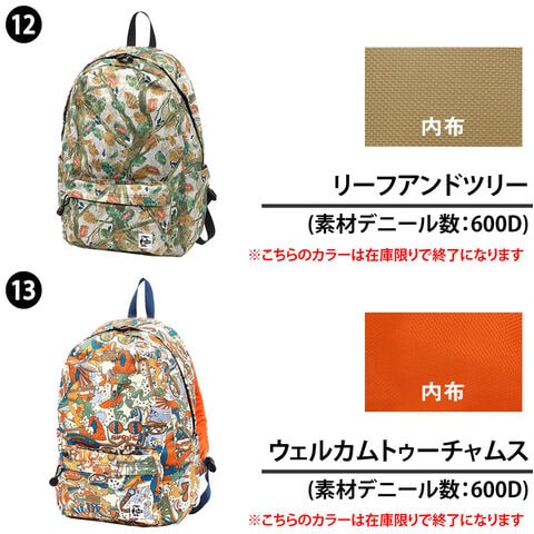 | カラー | 1.ブラック(-603961k001) 2.ネイビー(-99x603526n001) 3.グレージュ(-603961g057) 4.ピンク(-603961r018) 5.ダルブルー(-603961a088) 6.コーラルオレンジ(-603961d029) 7.トイズ(-603961z379) 8.ライブハウス(-603961z380) 9.Winter MT.カモ(-603961z381) 10.ブラウン(-99x603526b005) 11.トラベル(-99x603526z306) 12.リーフアンドツリー(-99x603526z291) 13.ウェルカムトゥーチャムス(-99x603526z292) | ||