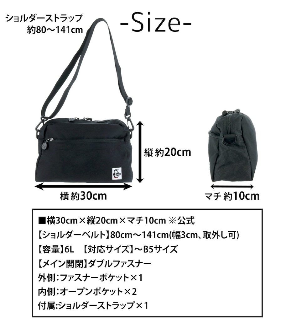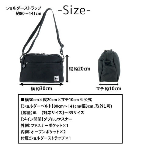 | サイズ(約) ※当店実寸値 | 公式サイズ 横30cm×縦20cm×マチ10cm 【ショルダーベルト】80cm~141cm(幅3cm、取外し可) 【容量】6L 【対応サイズ】~B5サイズ | ||