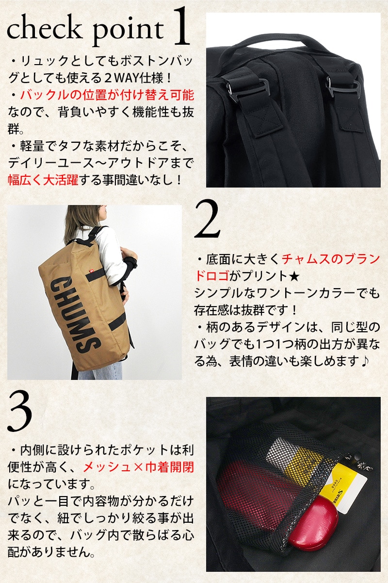 | 商品 | Recycle CHUMS 2way Boston ボストンバッグ リュックサック リサイクルチャムス2ウェイボストン | ||