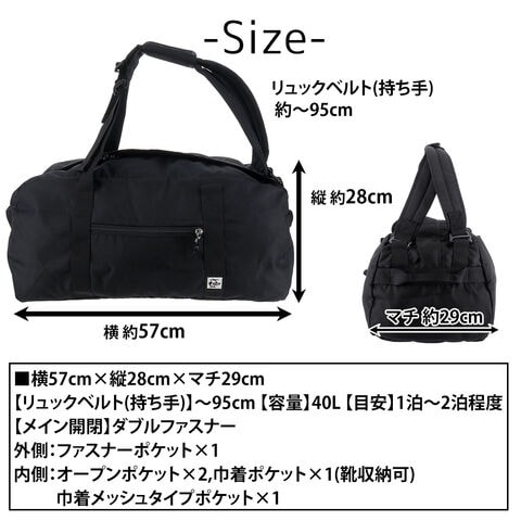 | サイズ(約) ※当店実寸値 | 公式サイズ 横57cm×縦28cm×マチ29cm 【リュックベルト(持ち手)】~95cm 【容量】40L 【目安】1泊~2泊程度 | ||