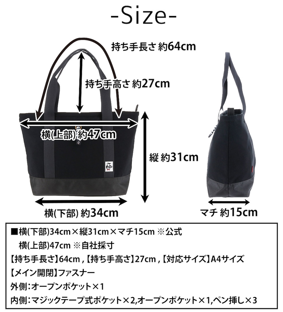 | サイズ(約) ※当店実寸値 | 公式サイズ 横(下部)34cm×縦31cm×マチ15cm 自社採寸サイズ 横(上部)47cm 【持ち手長さ】64cm 【持ち手高さ】27cm 【対応サイズ】A4サイズ 【容量】15L | ||