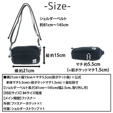 | サイズ(約) ※当店実寸値 | 公式サイズ 横21cm×縦15cm×マチ5.5cm(前ポケット抜) 自社採寸サイズ 本体マチ5.5cm(+前ポケットマチ1.5cm) 【ショルダーベルト長さ】81cm~145cm(幅2.5cm、取り外し可) 【容量】2.5L | ||