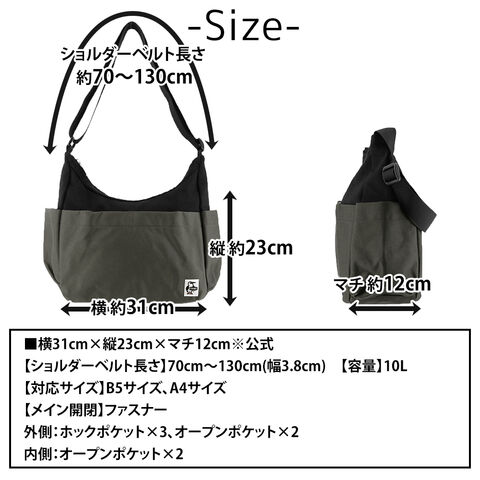 | サイズ(約) ※当店実寸値 | 公式サイズ 横31cm×縦23cm×マチ12cm 【ショルダーベルト長さ】70cm~130cm(幅3.8cm) 【容量】10L 【対応サイズ】B5サイズ、A4サイズ | ||