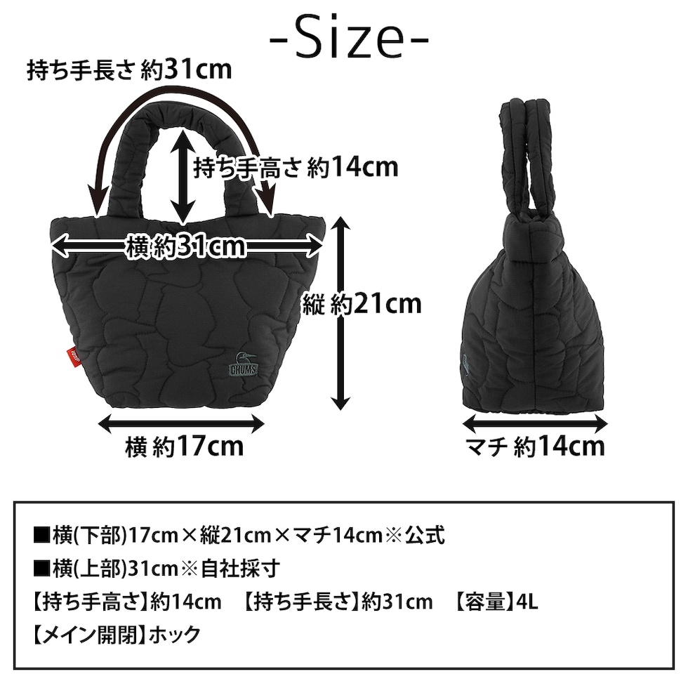 | サイズ(約) ※当店実寸値 | 公式サイズ 横(下部)17cm×縦21cm×マチ14cm 自社採寸サイズ 横(上部)31cm 【持ち手高さ】約14cm 【持ち手長さ】約31cm 【容量】4L | ||