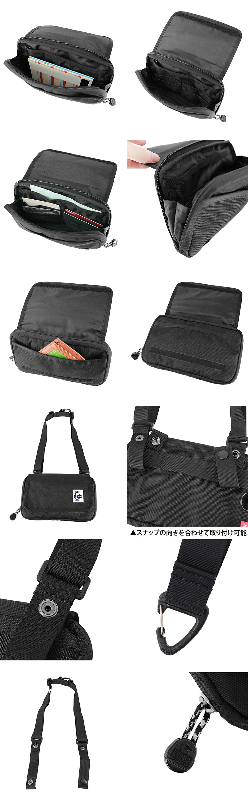 ラウンドファスナー仕様のお財布部分は大きく開いて中身が見やすく、ショルダーは斜めがけや首掛けが可能。