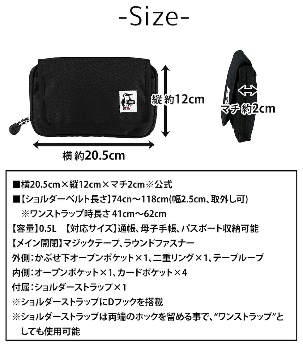 | サイズ(約) ※当店実寸値 | 公式サイズ 横20.5cm×縦12cm×マチ2cm 【ショルダーベルト長さ】74cn~118cm(幅2.5cm、取外し可) ※ワンストラップ時長さ 41cm~62cm 【容量】0.5L 【対応サイズ】通帳、母子手帳、パスポート収納可能 | ||