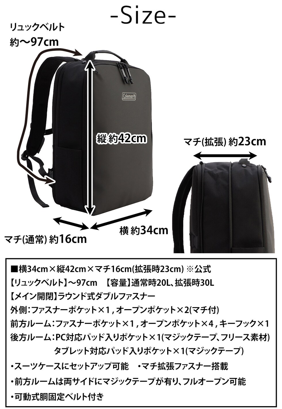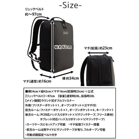 | サイズ(約) ※当店実寸値 | 公式サイズ 横34cm×縦42cm×マチ16cm(拡張時23cm) 【リュックベルト】~97cm 【容量】通常時20L、拡張時30L | ||