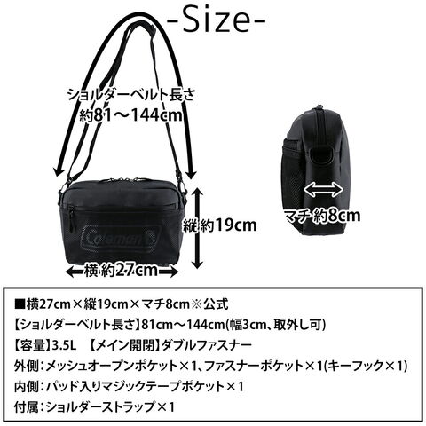 | サイズ(約) ※当店実寸値 | 公式サイズ 横27cm×縦19cm×マチ8cm 【ショルダーベルト長さ】81cm~144cm(幅3cm、取外し可) 【容量】3.5L | ||
