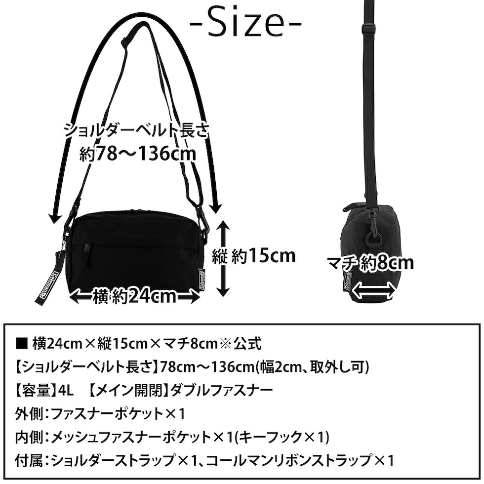 | サイズ(約) ※当店実寸値 | 公式サイズ 横24cm×縦15cm×マチ8cm 【ショルダーベルト長さ】78cm~136cm(幅2cm、取外し可) 【容量】4L | ||