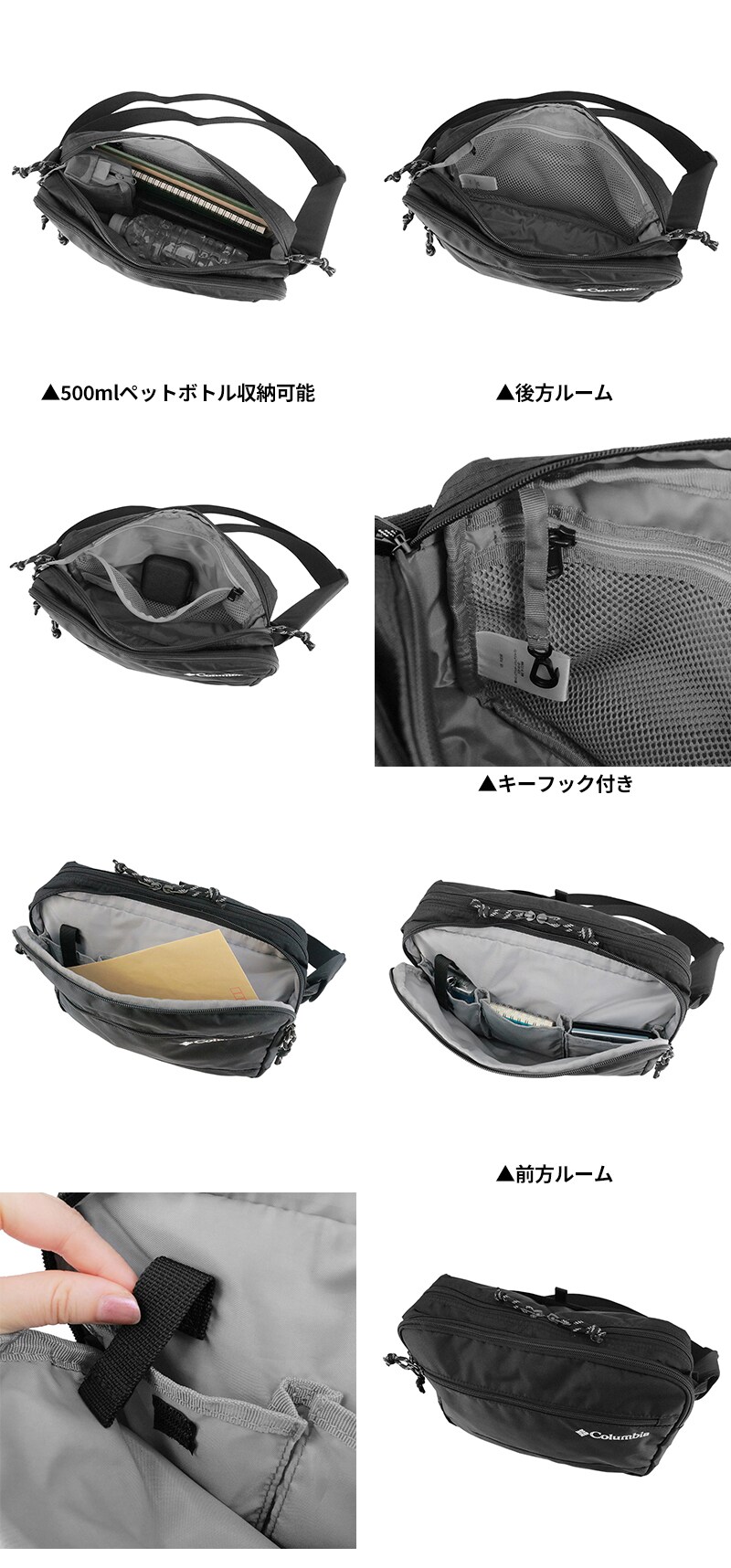 2室構造で、前方室にはマチ付きポケットを配置。厚みのある小物も収納しやすく、後方室は中身が見えるメッシュ仕様+キーフック付きで、鍵やカード類を迷子にせず管理できます。外側にも2種のポケットがあり、スマホやパスケースの仕分けもスムーズ。