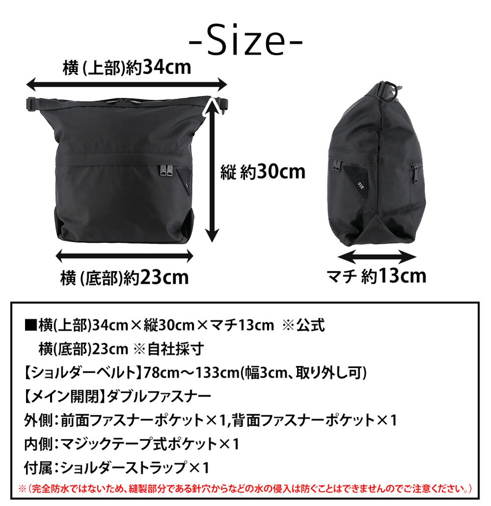 | サイズ(約) ※当店実寸値 | 公式サイズ 横(上部)34cm×縦30cm×マチ13cm 自社採寸 横(底部)23cm 【ショルダーベルト】78~133cm(幅3cm、取り外し可) 【容量】13L | ||