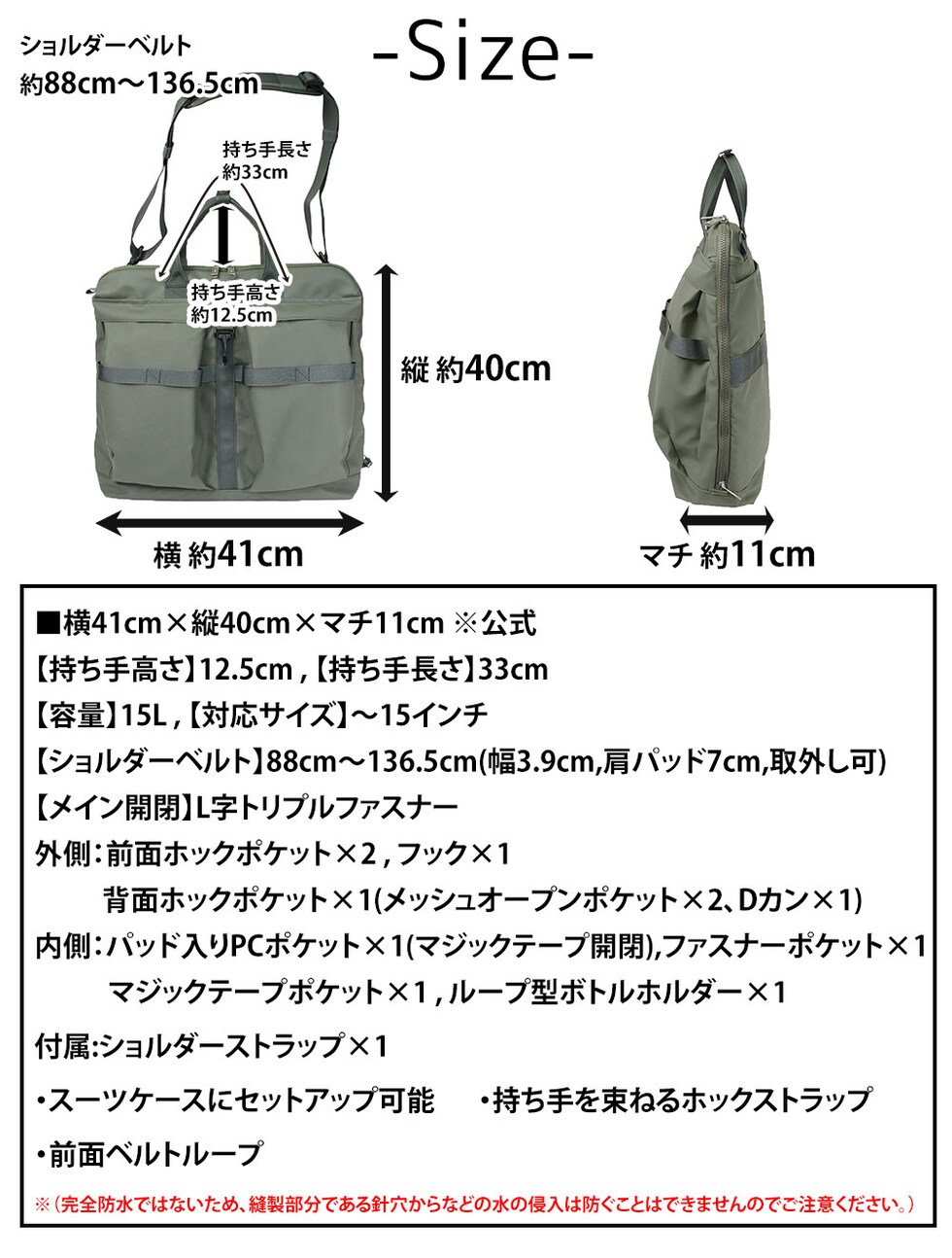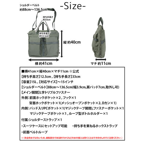 | サイズ(約) ※当店実寸値 | 公式サイズ 横41cm×縦40cm×マチ11cm 【持ち手高さ】12.5cm 【持ち手長さ】33cm 【ショルダーベルト】88cm~136.5cm(ショルダー幅3.9cm、肩パッド7cm、取外し可) 【容量】15L 【対応サイズ】~15インチ | ||