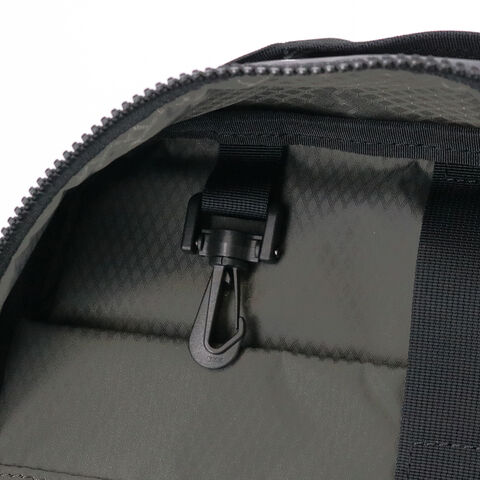テープディティールは高密度で織られた畝が特徴的、ミリタリーライクな高密度のトジ織のナイロンテープを使用。カラビナや小物等を引っ掛ける事を想定したテープ使いとなっております。