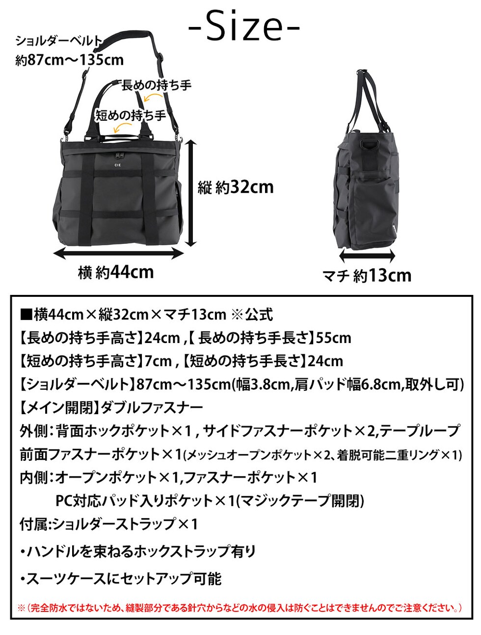| サイズ(約) ※当店実寸値 | 公式サイズ 横44cm×縦32cm×マチ13cm 【長め持ち手高さ】24cm 【長め持ち手長さ】55cm 【短め持ち手高さ】7cm 【短め持ち手長さ】24cm 【ショルダーベルト】87cm~135cm(ショルダー幅3.8cm、肩パッド幅6.8cm、取外し可) | ||