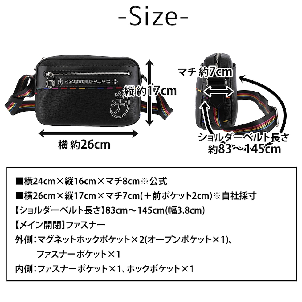 | サイズ(約) ※当店実寸値 | 公式サイズ 横24cm×縦16cm×マチ8cm 自社採寸サイズ 横26cm×縦17cm×マチ7cm(+前ポケット2cm) 【ショルダーベルト長さ】83cm~145cm(幅3.8cm) | ||