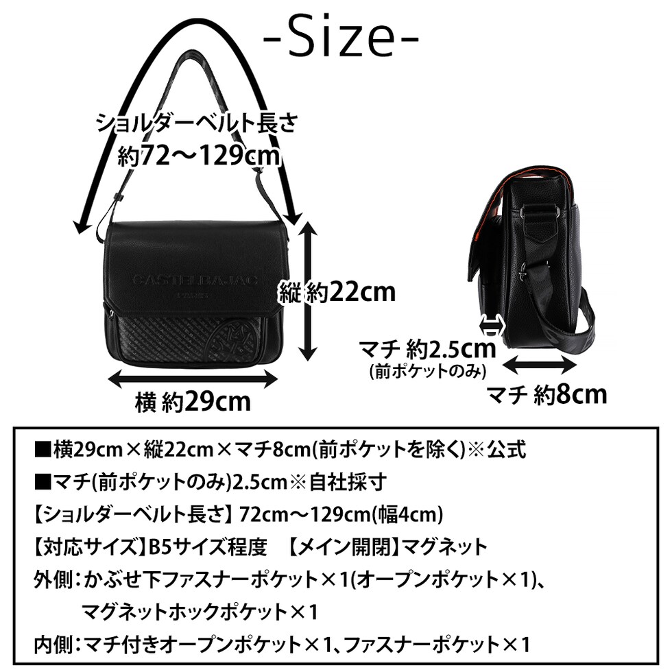 | サイズ(約) ※当店実寸値 | 公式サイズ 横29cm×縦22cm×マチ8cm(前ポケットを除く) 自社採寸サイズ マチ(前ポケットのみ)2.5cm 【ショルダーベルト長さ】72cm~129cm(幅4cm) 【対応サイズ】B5サイズ程度 | ||