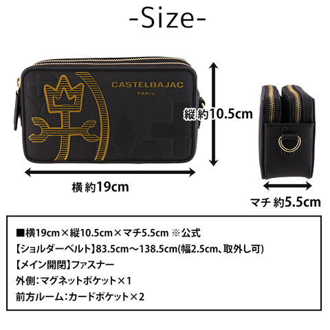 | サイズ(約) ※当店実寸値 | 公式サイズ 横19cm×縦10.5cm×マチ5.5cm 【ショルダーベルト】83.5cm~138.5cm(幅2.5cm、取外し可) | ||