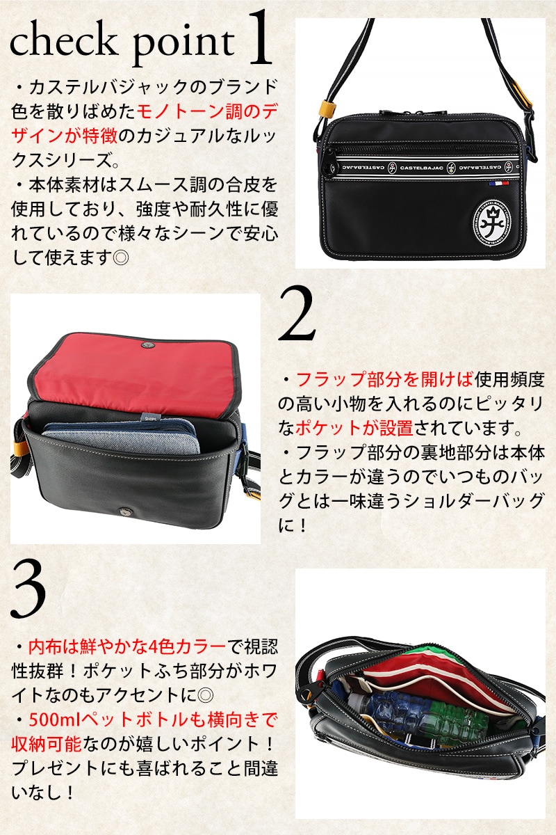 ブランドの4原色をポイントで使用し、節々にブランドを表現した、カステルバジャック好きにピッタリのカジュアルバッグ『ルックス』のショルダーバッグ。