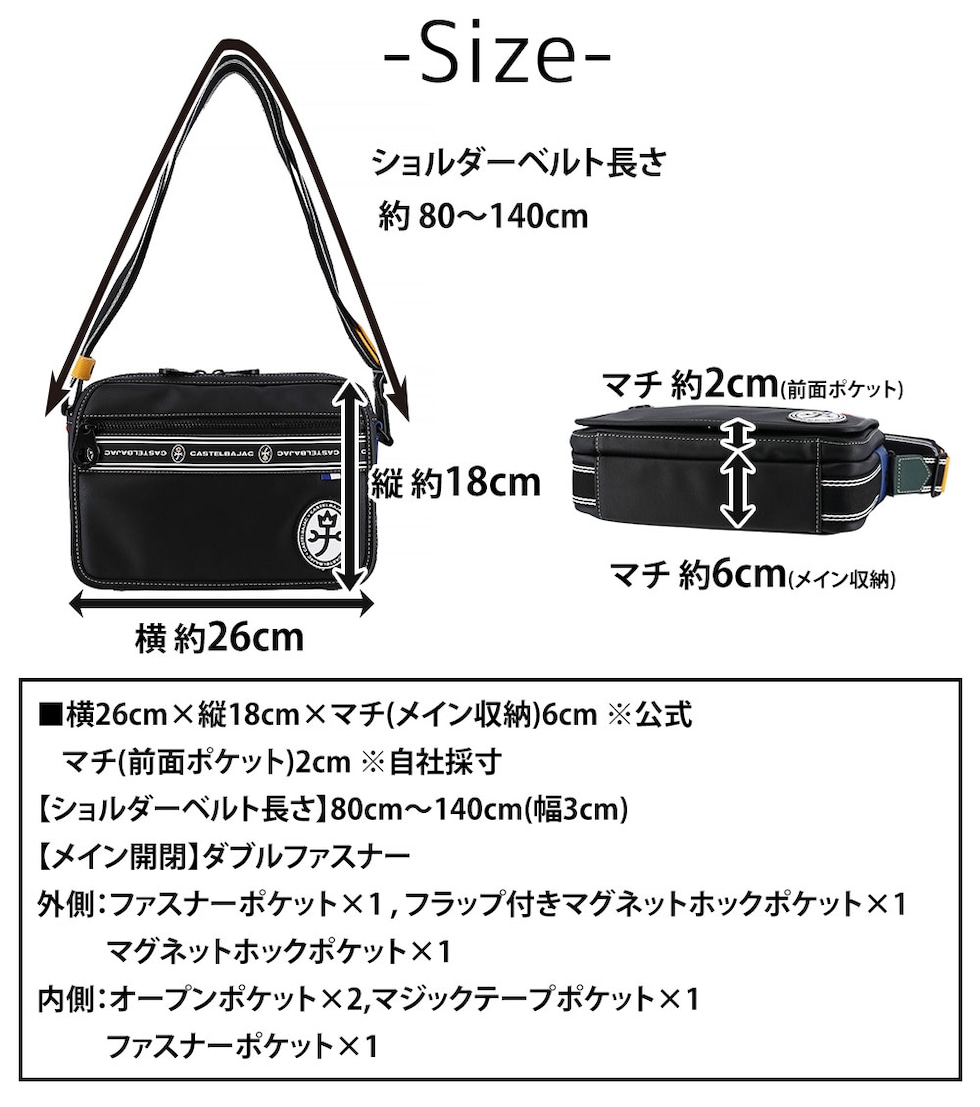 | サイズ(約) ※当店実寸値 | 公式サイズ 横26cm×縦18cm×マチ(メイン収納)6cm 自社採寸サイズ マチ(前面ポケット)2cm 【ショルダーベルト長さ】80cm~140cm(幅3cm) | ||