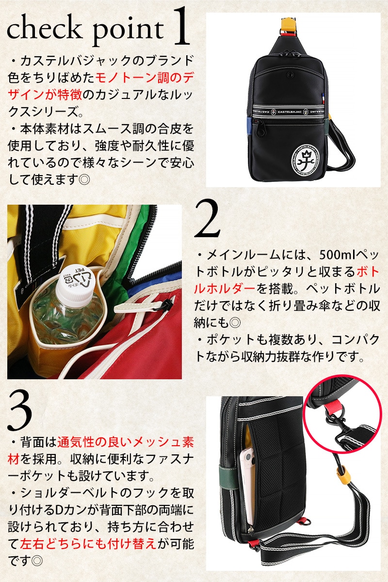 ブランドの4原色をポイントで使用し、節々にブランドを表現した、カステルバジャック好きにピッタリのカジュアルバッグ『ルックス』のワンショルダーバッグ。