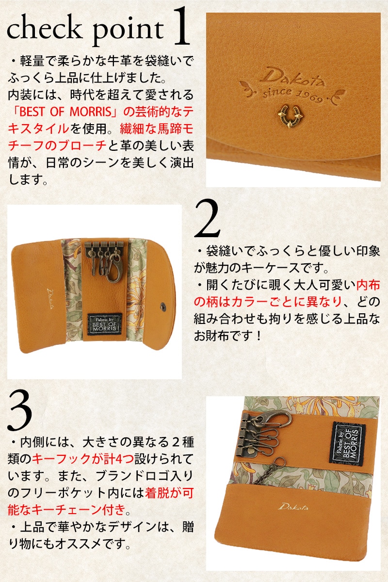| 備考 | 【メイン開閉】ホック 内側/ キーフック×4(大×1、小×3) フリーポケット×1(着脱可能キーチェーン×1) ■梱包状態:箱 キーワード : 20代 30代 40代 50代 60代 ピンパネル ピンパーネル ハニーサックル いちご泥棒 ウィリアム・モリス 入学祝い 就職祝い 誕生日 記念日 自分用 フォーマル カジュアル クラシカル 仕事 スーツ OL オフィスカジュアル ガーリー エレガント シンプル 小銭入れなし 薄い スリム 三つ折り 3つ折り スマートキー key case 黒 黄色 青 小さめ 柔らかい ソフトレザー プレゼント ギフト 贈り物 サプライズ 感謝 ご褒美 彼女 恋人 友達 大切 経年変化 一粒万倍 吉日 寅の日 巳の日 メンズ レディース 女性 通勤 通学 ビジネス 学生 ブランド ポイント消化 ニューバッグワカマツ ニューバックワカマツ | ||