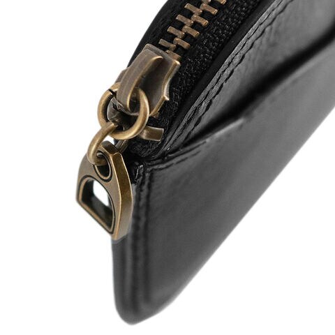 ファスナー式のメイン収納はマチを持たせないことで厚みを抑え、手のひらやポケットに収めても膨らまないスリムなシルエットに。