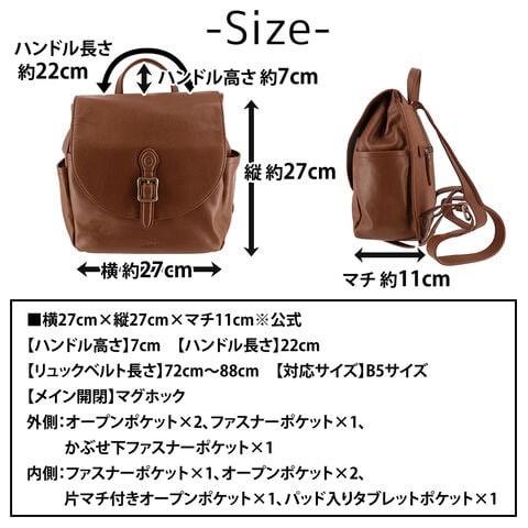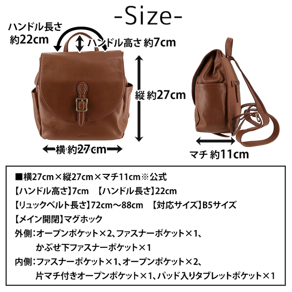 | サイズ(約) ※当店実寸値 | 公式サイズ 横27cm×縦27cm×マチ11cm 【ハンドル高さ】7cm 【ハンドル長さ】22cm 【リュックベルト長さ】72cm~88cm 【対応サイズ】B5サイズ | ||