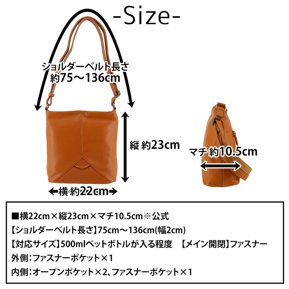 | サイズ(約) ※当店実寸値 | 公式サイズ 横22cm×縦23cm×マチ10.5cm 【ショルダーベルト長さ】75cm~136cm(幅2cm) 【対応サイズ】500mlペットボトルが入る程度 | ||
