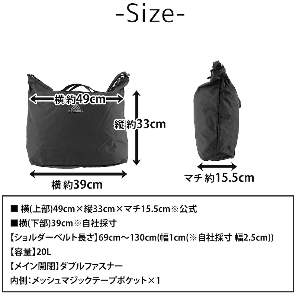 | サイズ(約) ※当店実寸値 | 公式サイズ 横(上部)49cm×縦33cm×マチ15.5cm 自社採寸サイズ 横(下部)39cm 【ショルダーベルト長さ】69cm~130cm(幅1cm(※自社採寸 幅2.5cm)) 【容量】20L | ||