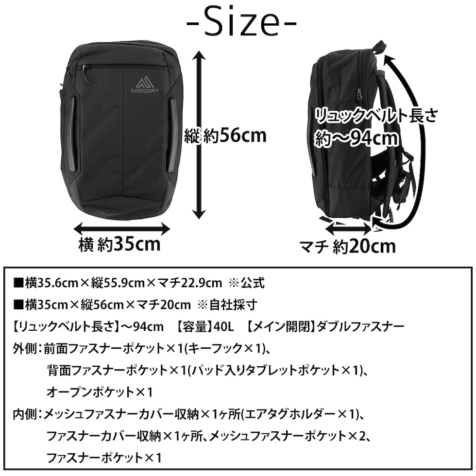 | サイズ(約) ※当店実寸値 | 公式サイズ 横35.6cm×縦55.9cm×マチ22.9cm 自社採寸サイズ 横35cm×縦56cm×マチ20cm 【リュックベルト長さ】~94cm 【容量】40L | ||