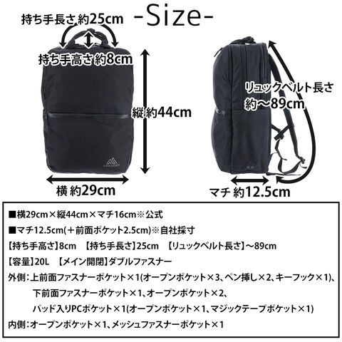 | サイズ(約) ※当店実寸値 | 公式サイズ 横29cm×縦44cm×マチ16cm 自社採寸サイズ マチ12.5cm(+前面ポケット2.5cm) 【持ち手高さ】8cm 【持ち手長さ】25cm 【リュックベルト長さ】~89cm 【容量】20L | ||