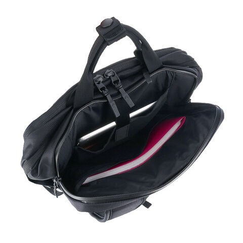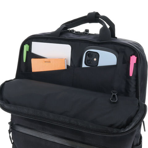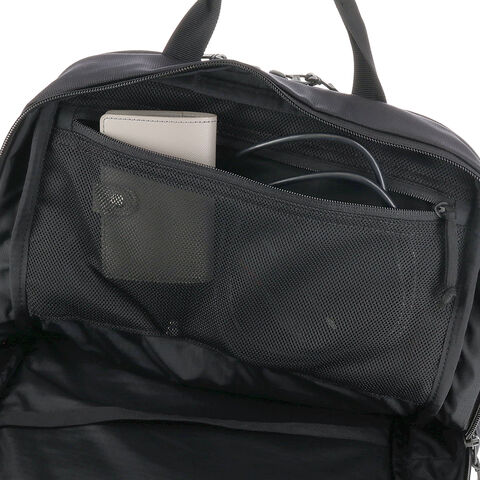 たっぷりのメインスペースに加え、デバイス専用コンパートメントやフロントポケットなど、充実した収納性を誇ります。
