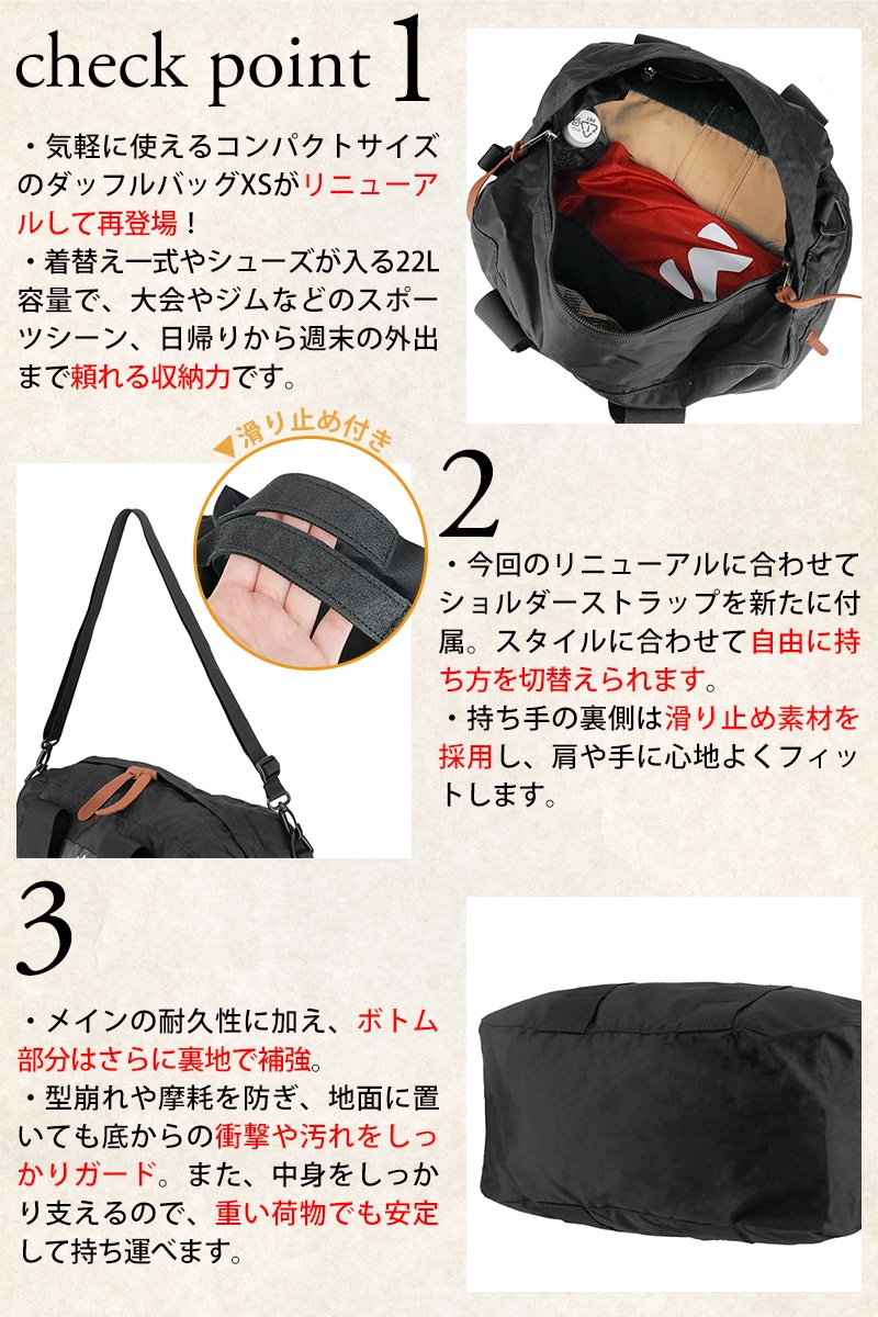 小ぶりなサイズで日常的に活躍するダッフルバッグ(XSサイズ)が、さらに使いやすくなって再登場!