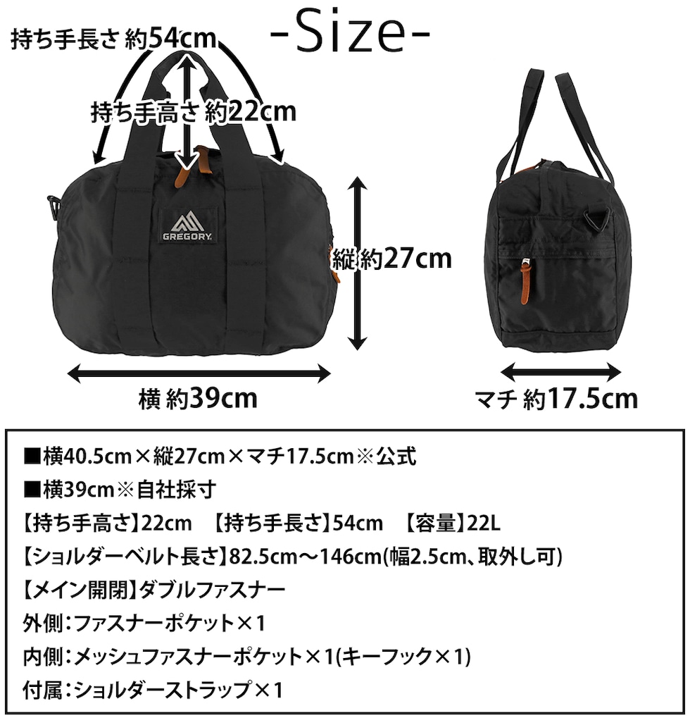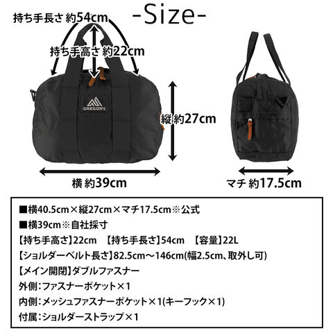 | サイズ(約) ※当店実寸値 | 公式サイズ 横40.5cm×縦27cm×マチ17.5cm 自社採寸サイズ 横39cm 【持ち手高さ】22cm 【持ち手長さ】54cm 【ショルダーベルト長さ】82.5cm~146cm(幅2.5cm、取外し可) 【容量】22L | ||
