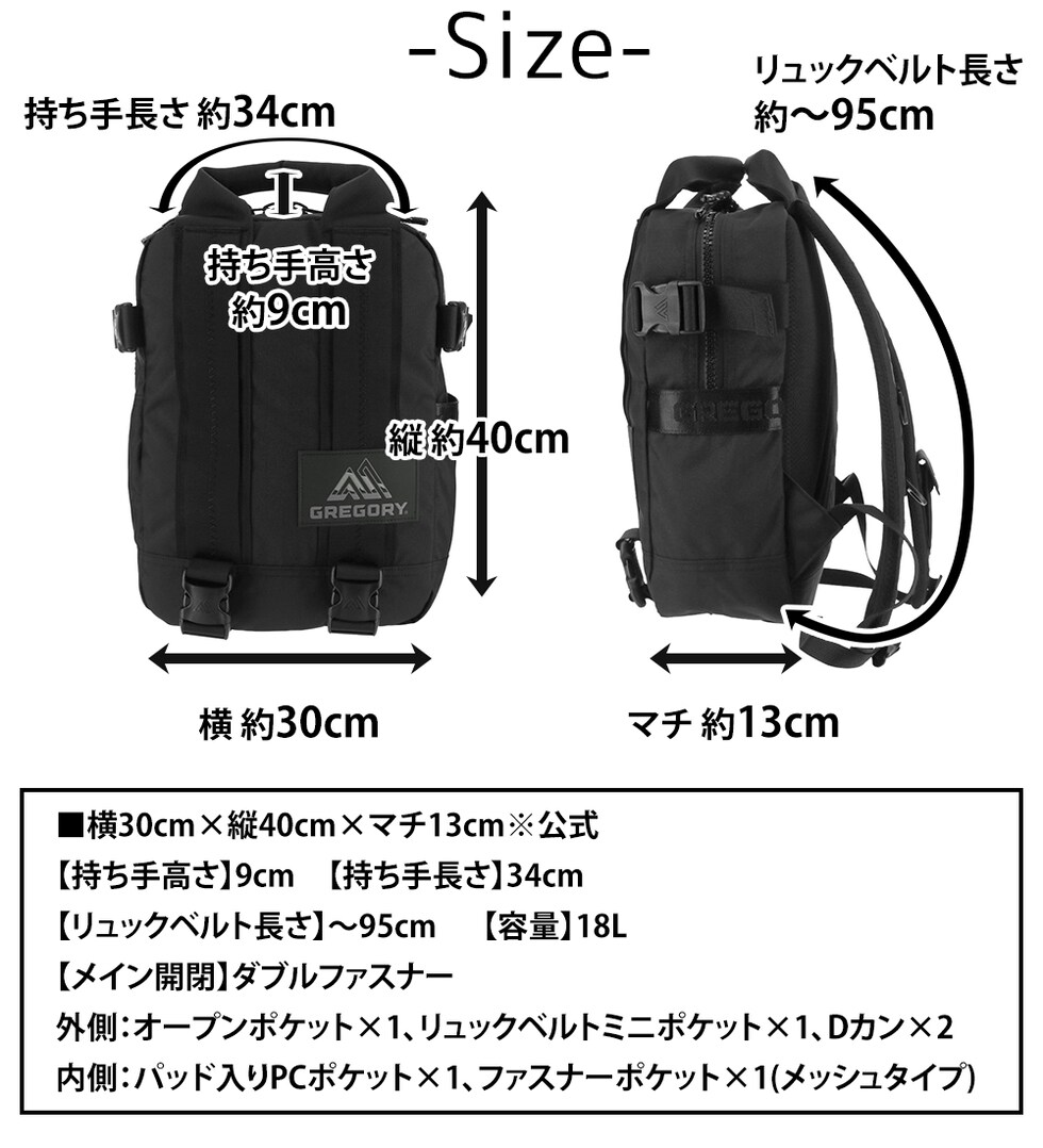 | サイズ(約) ※当店実寸値 | 公式サイズ 横30cm×縦40cm×マチ13cm 【持ち手高さ】9cm 【持ち手長さ】34cm 【リュックベルト長さ】~95cm 【容量】18L | ||