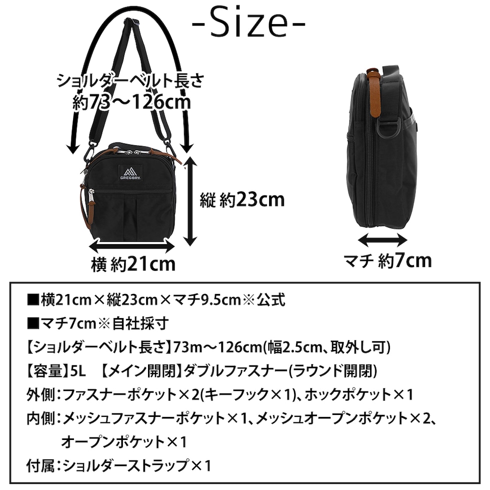 | サイズ(約) ※当店実寸値 | 公式サイズ 横21cm×縦23cm×マチ9.5cm 自社採寸サイズ マチ7cm 【ショルダーベルト長さ】73m~126cm(幅2.5cm、取外し可) 【容量】5L | ||