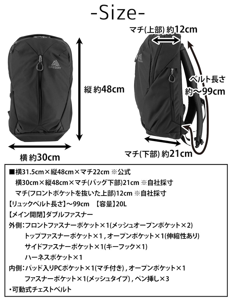 | サイズ(約) ※当店実寸値 | 公式サイズ 横31.5cm×縦48cm×マチ22cm 自社採寸サイズ 横30cm×縦48cm×マチ(バッグ下部)21cm フロントポケットを抜いたバッグ上部のマチ:12cm 【リュックベルト】~99cm 【容量】20L | ||