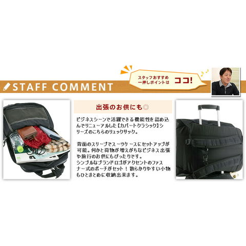 | 備考 | 【メイン開閉】ダブルファスナー 外側/ オープンポケット×1 ファスナーポケット×1(オープンポケット×2、ペン挿し×2) 背面パッド入りファスナーポケット×1(中にオープンポケット×1) 内側/ ファスナーポケット×1 オープンポケット×1 ホック式ポケット×1 ※スーツケースにセットアップ可 ※可動式チェストベルト有 | ||