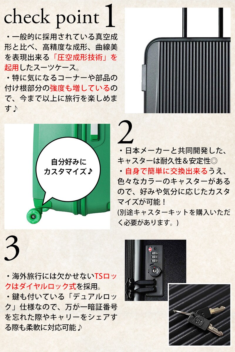 | 備考 | 【メイン開閉】ファスナータイプ 内側/ ファスナーカバー収納×2ヶ所 クロスベルト×2 付属/ 鍵×2 オリジナルラゲッジタグ×1 ■耐久性・耐摩耗性・安定走行に優れた「交換式キャスター」 ■ダイヤルロック・ユーザーキーのどちらでも解錠できる「デュアルロック」 ■ワンタッチで簡単操作「ブレーキシステム」 ■積み込みをサポートする「四つのハンドル仕様」 キーワード: 保証付き BOARD CARRY メンズ レディース シンプル 男性 女性 ビジネス 出張 研修 旅行 海外 長期 温泉 8泊 9泊 10泊 1週間 軽量 ダイヤルロック キャスターロック 静か 静音 滑らか キャスター交換 キャスター外れる ビビットカラー ストライプ ワンカラー 耐久性 青色 水色 緑色 黒色 黄色 Lサイズ 大きめ 100リットル 2室 学生 ブランド ポイント消化 ニューバッグワカマツ ニューバックワカマツ | ||