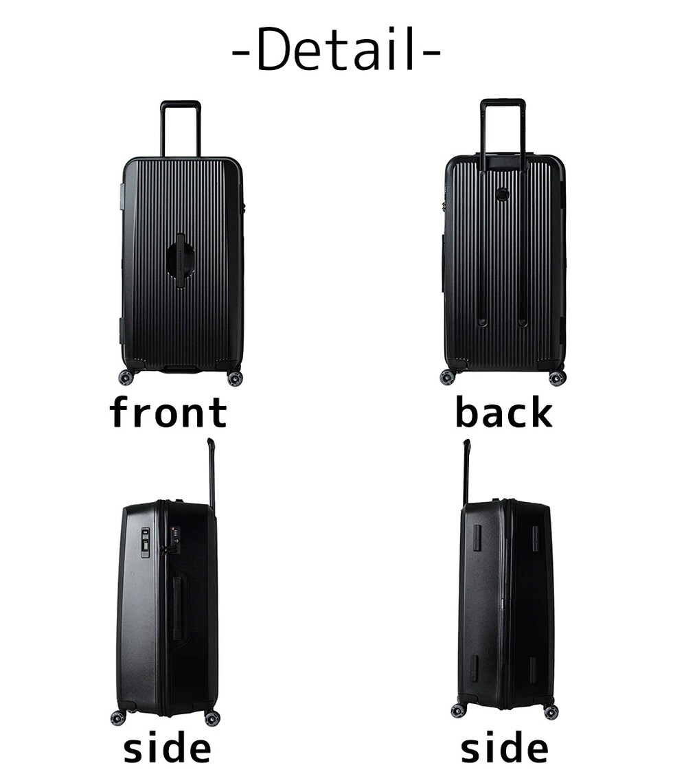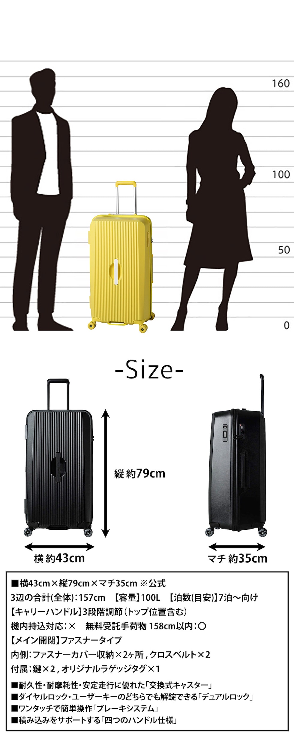 | サイズ(約) ※当店実寸値 | 公式サイズ 全体:横43cm×縦79cm×マチ35cm 3辺の合計(全体):157cm 機内持込対応:× 無料受託手荷物 158cm以内:〇 【容量】100L 【泊数(目安)】7泊~向け 【キャリーハンドル】3段階調節(トップ位置含む) ※全体サイズはキャスター・ハンドルを含んだサイズです。 | ||