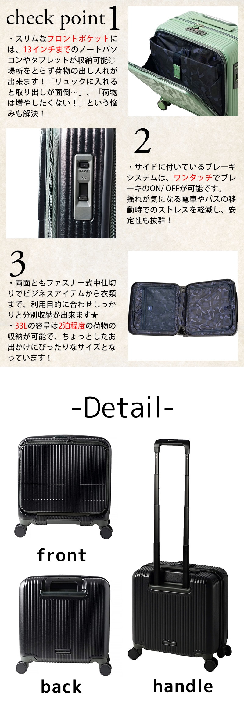 | 備考 | 【メイン開閉】ファスナータイプ 外側/ ▼フロントファスナーポケット×1 メッシュポケット×2 ファスナーポケット×1 PC収納ポケット×1(タブレット収納ポケット×1) 内側/ ▼前面側ファスナー収納 メッシュタイプファスナーポケット×1 ▼背面側ファスナー収納 付属/ エアメールモチーフポーチ×1 ネームタグ×1 ■フロントファスナーポケット内から前面側ファスナー収納にアクセス可能なファスナー有 ■13インチ程度までのノートPCやタブレットが収納可能 ■TSAロック搭載(ダイヤル式) ■機内持込可(国際線、国内線100席以上) ■Lisof キャスター(日本メーカー HINOMOTO社製)を採用 ■ワンタッチでブレーキのオン・オフが可能 キーワード: 保証付き EXTREME JOURNEY メンズ レディース 定番 人気 売れ筋 シンプル 男性 女性 ビジネス 出張 旅行 温泉 1泊 2泊 軽量 ダイヤルロック キャスターロック 静か 静音 滑らか TSロック ポーチ付き マットキャリー 鏡面キャリー パステルカラー ビビットカラー くすみカラー ネイビー 水色 白色 緑色 薄緑 灰色 黒色 黄色 紺色 薄紫 オフホワイト ペイルブルー ペイルグリーン ペイルオレンジ Sサイズ コンパクト PC収納 13inch フロント収納 フロントポケット 学生 ブランド ポイント消化 ニューバッグワカマツ ニューバックワカマツ | ||