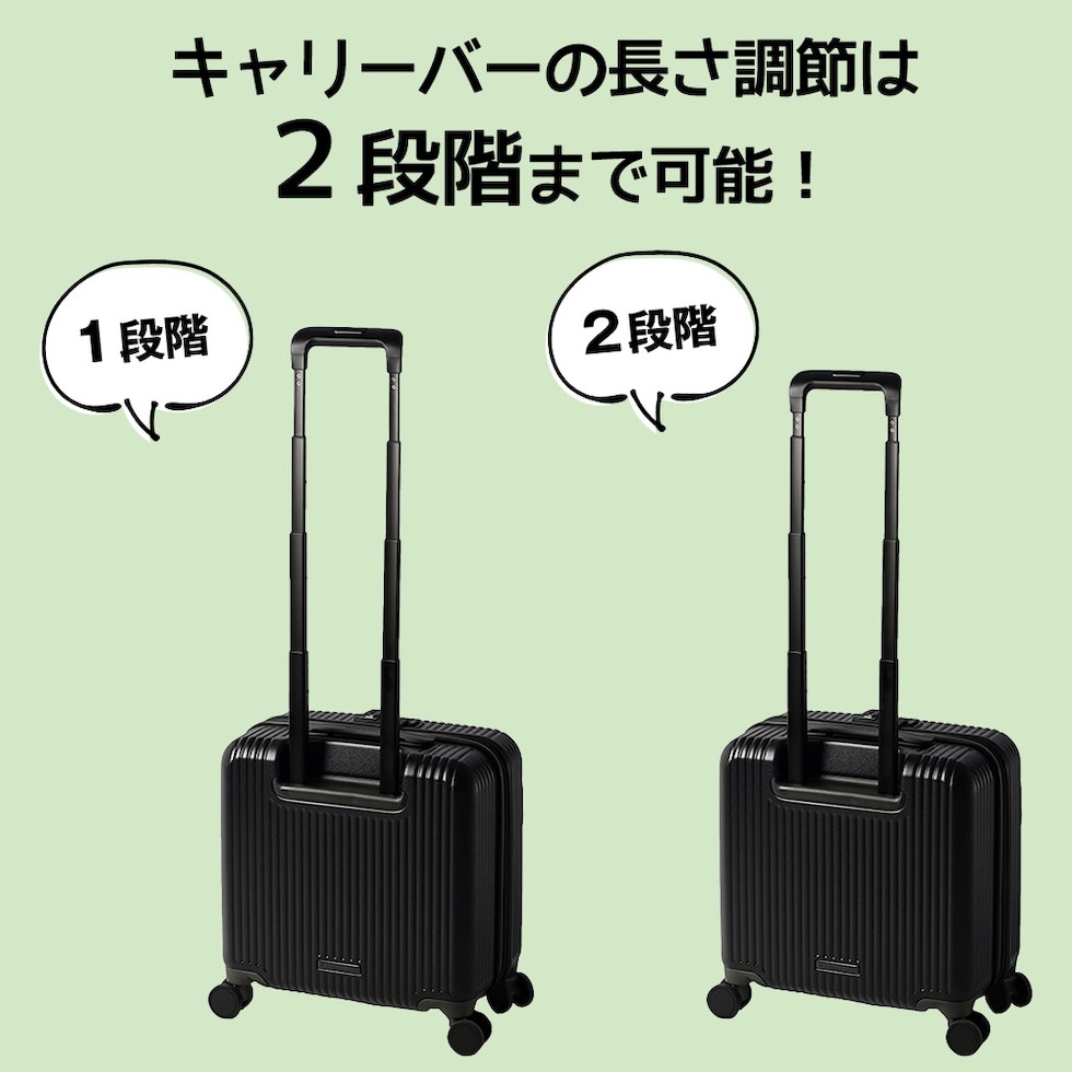 機内持ち込みも可能なサイズです。キャリーバーは2段階調整が可能。