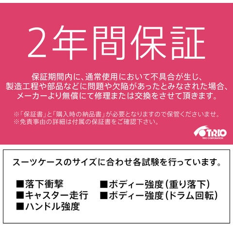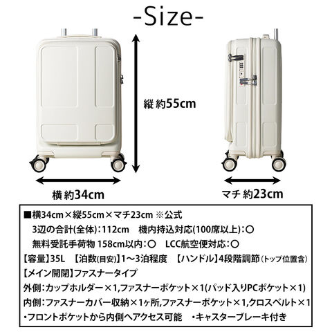 | サイズ(約) ※当店実寸値 | 公式サイズ 全体:横34cm×縦55cm×マチ23cm 3辺の合計(全体):112cm 機内持込対応(100席以上):〇 無料受託手荷物 158cm以内:〇 LCC航空便対応:〇 【容量】35L 【泊数(目安)】1~3泊程度向け 【キャリーハンドル】4段階調節(トップ位置含む) ※全体サイズはキャスター・ハンドルを含んだサイズです。 | ||