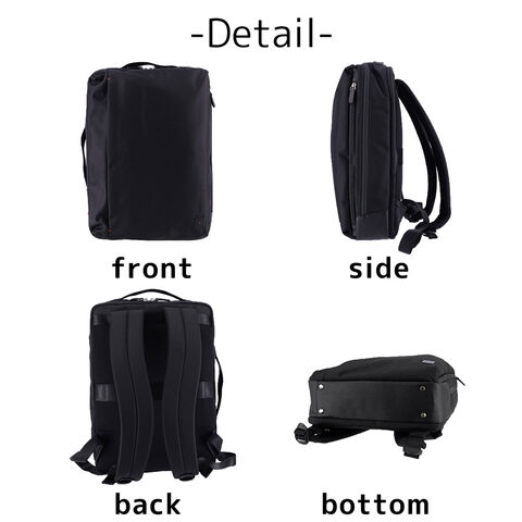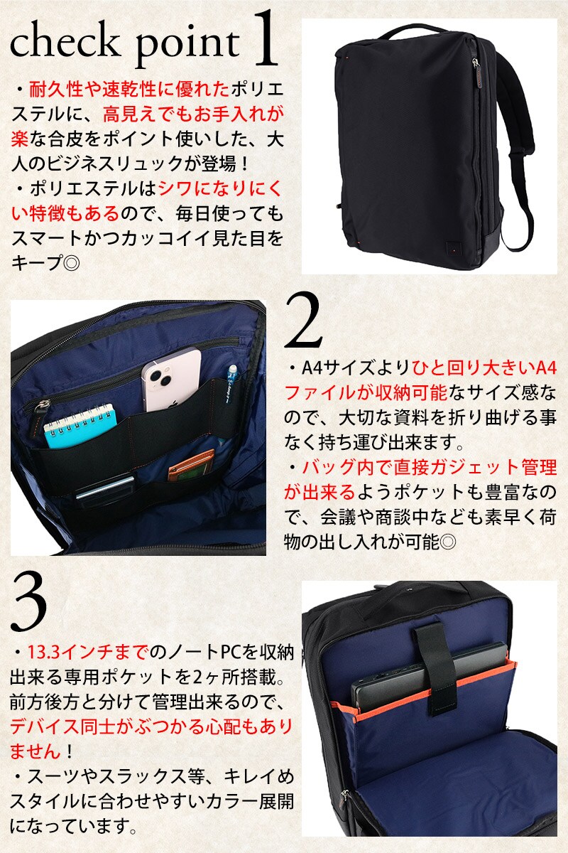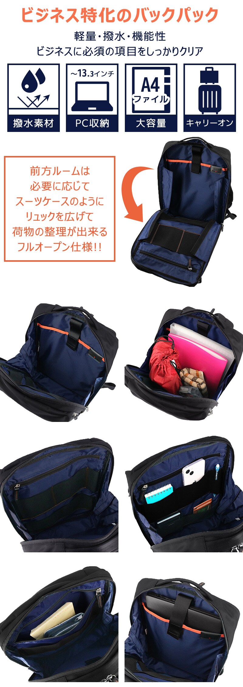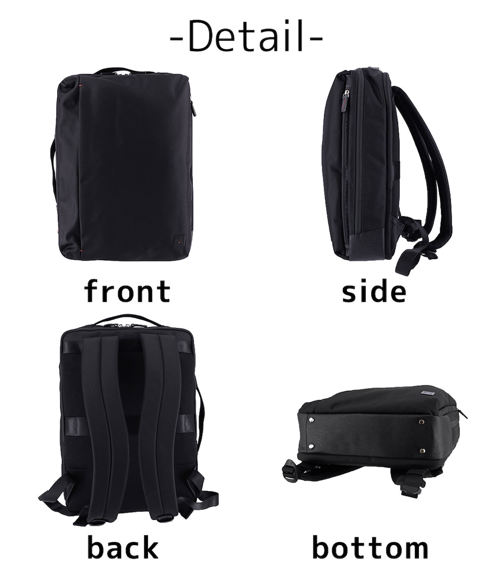・13.3インチまでのノートPCやA4ファイル、500mlペットボトル等を管理出来る多機能なポケットが充実。
