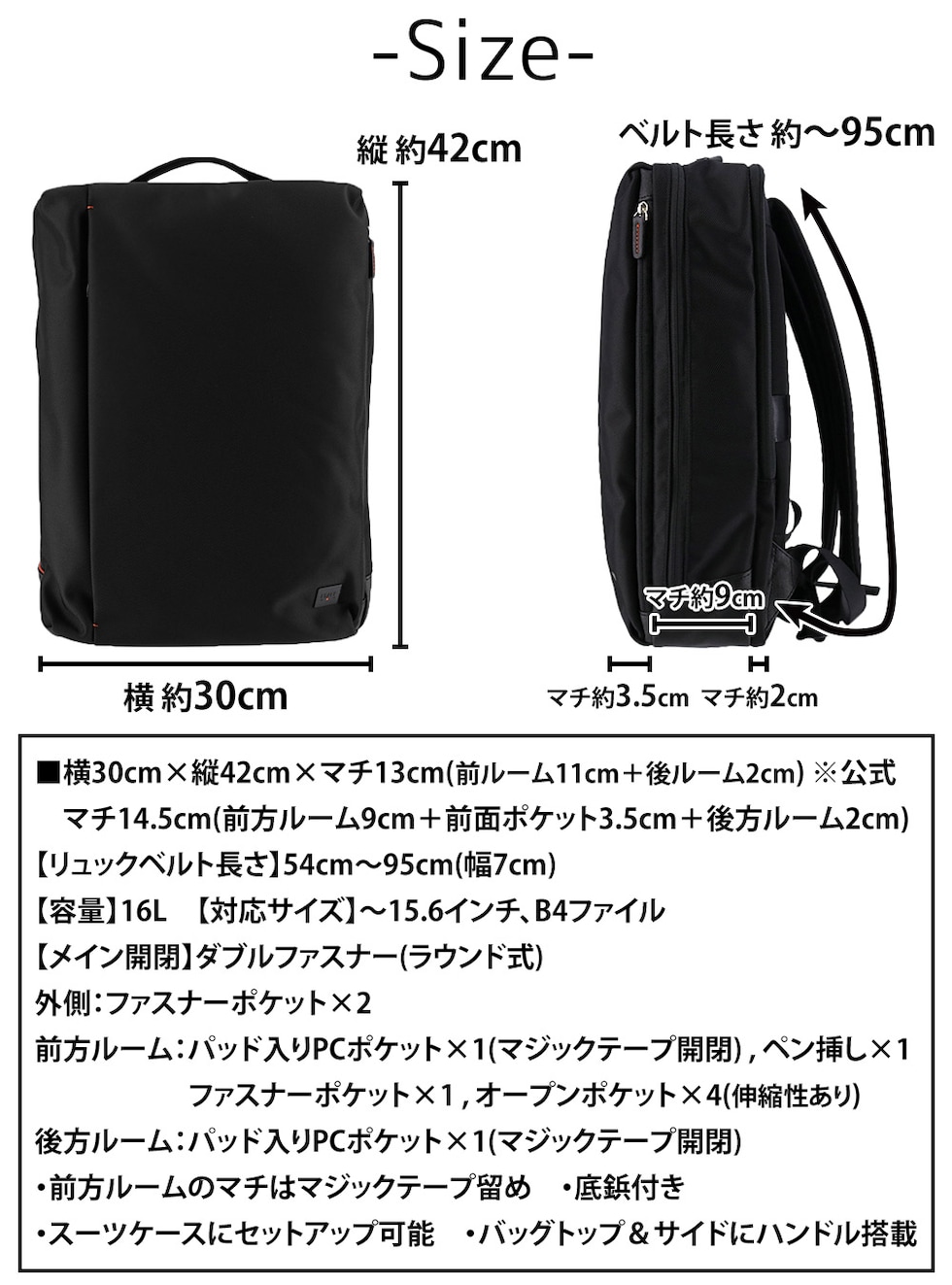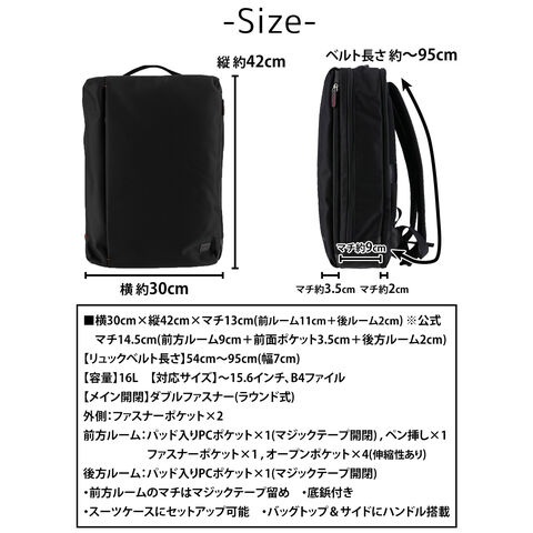 | サイズ(約) ※当店実寸値 | 公式サイズ 横30cm×縦42cm×マチ13cm(前方ルーム11cm+後方ルーム2cm) 自社採寸サイズ マチ14.5cm(前方ルーム9cm+前面ポケット3.5cm+後方ルーム2cm) 【リュックベルト長さ】54cm~95cm(幅7cm) 【容量】16L 【対応サイズ】~15.6インチ、B4ファイル | ||