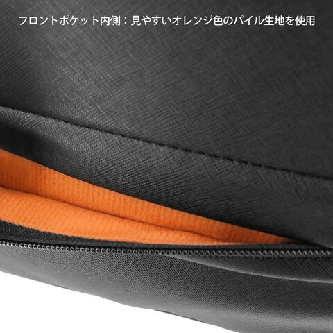 外側のファスナーポケットには見やすいオレンジ色のパイル生地を使用する事で、スマホ等を入れても画面を傷つける心配がありません。
