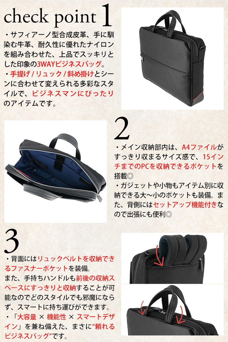 | 商品 | サフィールII 3WAYビジネスバッグ ショルダーバッグ リュックサック A4 | ||
