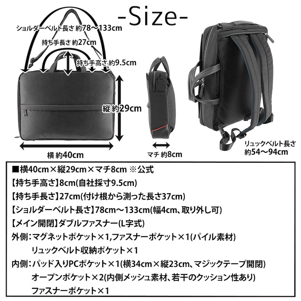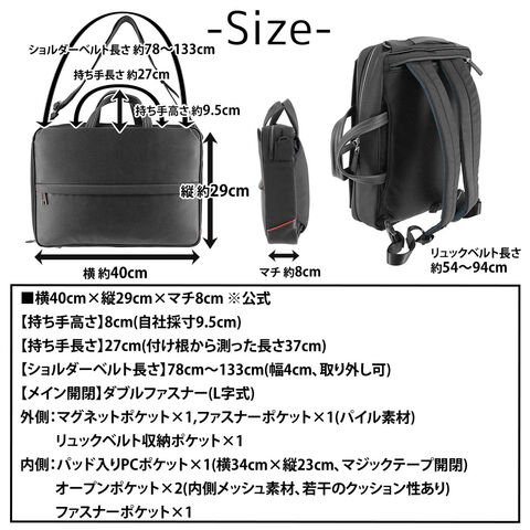 | サイズ(約) ※当店実寸値 | 公式サイズ 横40cm×縦29cm×マチ8cm 【持ち手高さ】8cm(自社採寸9.5cm) 【持ち手長さ】27cm(付け根から測った長さ37cm) 【ショルダーベルト長さ】78cm~133cm(幅4cm、取り外し可) 【リュックベルト長さ】54cm~94cm(幅7cm、背面に収納可能) 【対応サイズ】~15インチ、A4ファイル | ||